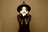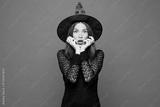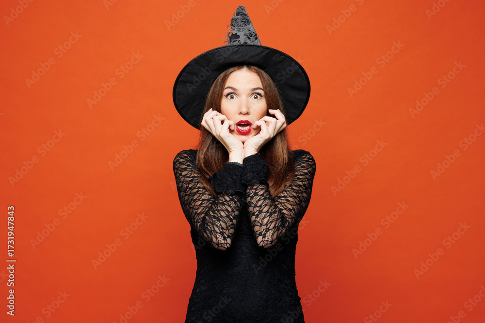 Young shocked surprised scared woman she wear black hat dress witch costume look camera isolated on plain red orange color wall background studio portrait. Celebration Halloween holiday party concept