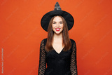 Young smiling happy beautiful Caucasian woman she wears black hat dress witch costume look camera isolated on plain red orange background studio portrait. Celebration Halloween holiday party concept.