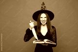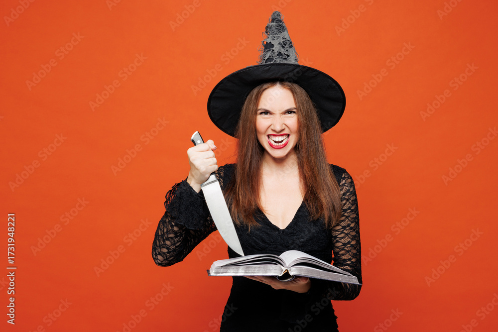 Young woman she wear black hat dress wicked witch costume hold knife and magic book scream spell isolated on plain red orange background studio portrait. Celebration Halloween holiday party concept.