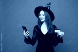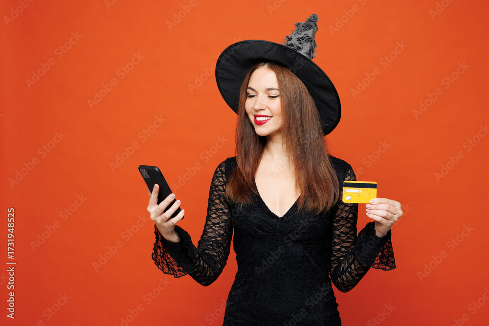 Young woman wears black hat dress witch costume use mobile cell phone hold credit bank card shopping online isolated on plain red orange background studio. Celebration Halloween holiday party concept.