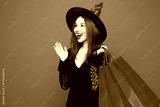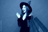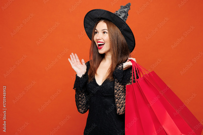 Young fun woman wears hat dress witch costume hold shopping package bags isolated on plain red orange background studio portrait Celebration Halloween holiday party, Black Friday sale buy day concept