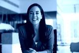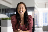 Portrait of happy Latin businesswoman engaged in virtual meeting