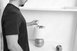 Man changing light bulb in stylish lamp indoors, closeup. Space for text