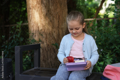 Cute little girl holding school lunch box with food on bench outdoors
