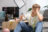 Man with glass of alcohol suffering from hangover on floor in messy room after party