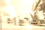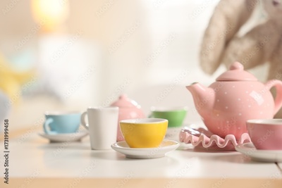 Tea set on white table indoors, closeup with space for text. Child's toy
