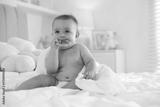 Cute baby with white towel and teether after bathing on bed at home, space for text