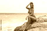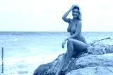 Beautiful woman wearing stylish bikini on rocks at beach, space for text