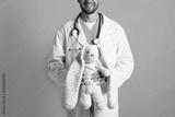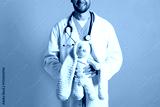 Pediatrician with toy bunny on green background, closeup