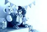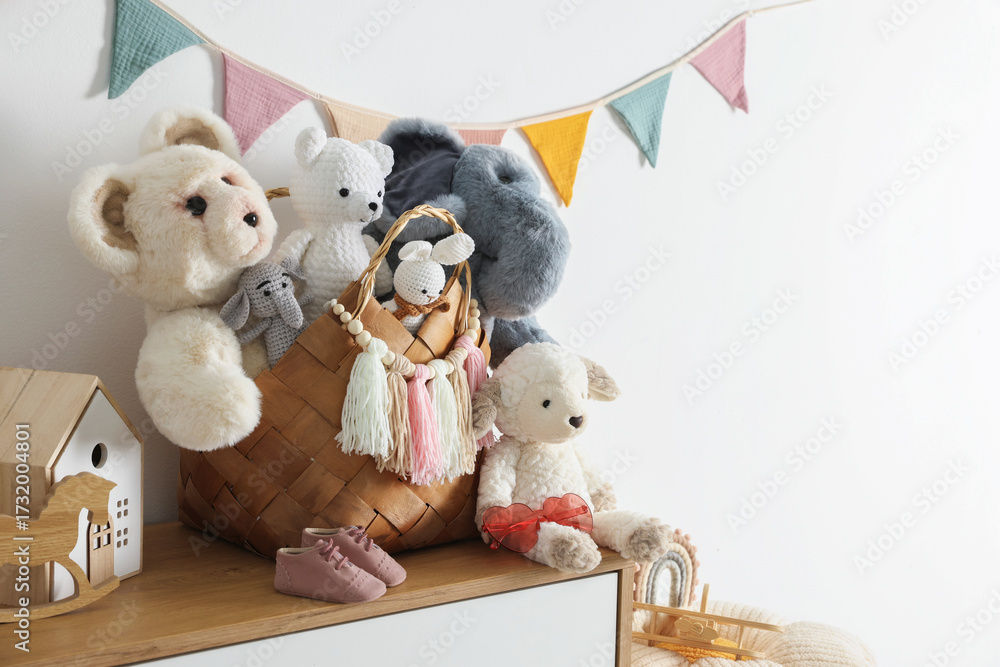 Different toys on chest of drawers near white wall indoors. Space for text