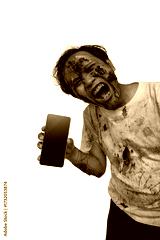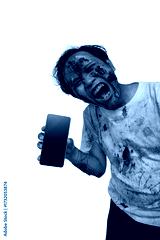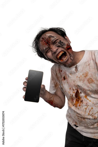 Portrait of a scary male zombie with a wound and blood on the body holding a cellphone isolated over a white background. Mockup or Copy space. Spooky expression. Concept of Halloween or Horror