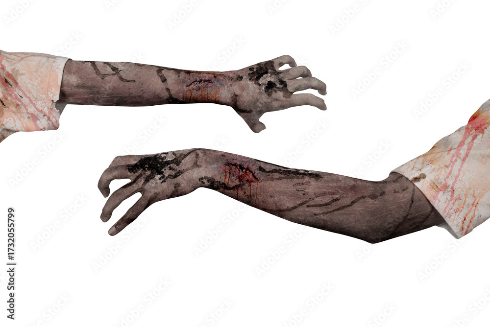 The zombies hand with wounds and blood try to reach something isolated over a white background. Zombie, devil, evil, satan, or monster hand. Concept of Halloween or Horror