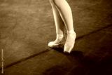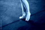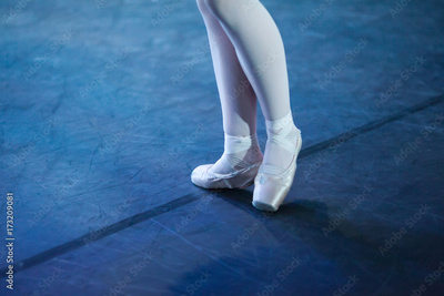 outfit, accessories, ballet concept. light pink pointe shoes has special form for unique feet of girl and two wight ribbons on each legs wrap around her ankles in opposite directions