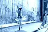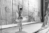 decoration, backstage, theater. man with camera taking photos of magnificent ballerina wearing for rehearsal in tutu and blue tracksuit top trying few movements