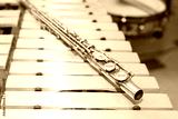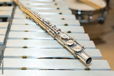 symphonic and brass band, percussion and wind instrument concept - beautiful closeup on western concert flute lies on beige bars of xylophone, orchestra, ensembles, jazz concerts, selective focus