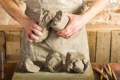 potter, tools, ceramics art concept - front view on hands of young master holding the large pieces of fireclay, male dressed in an apron, a ceramist with raw materials on table