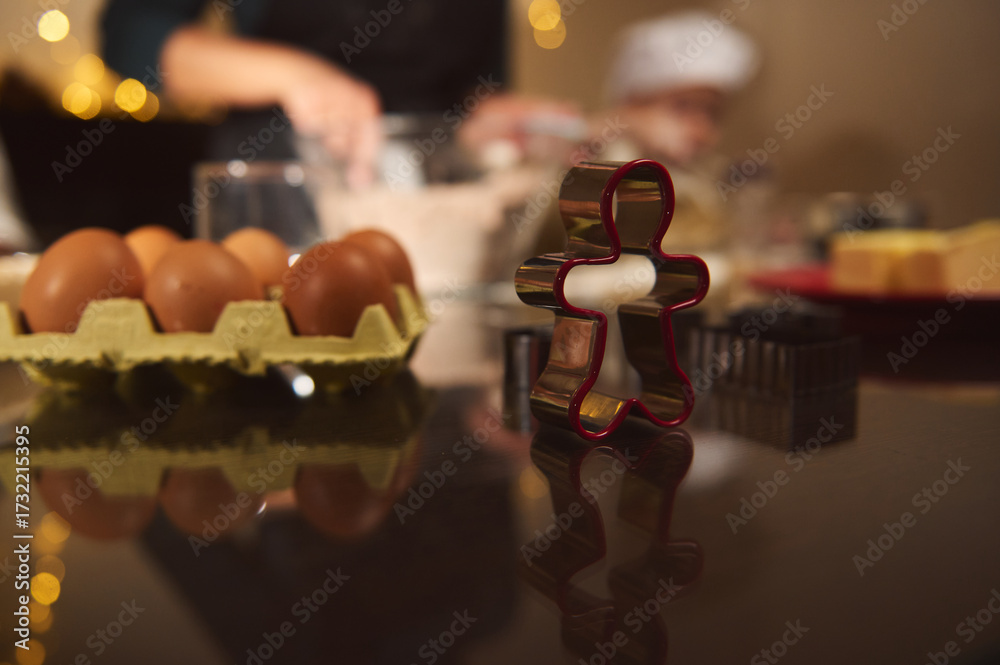 Family Christmas Baking Scene With Eggs, Gingerbread Cutter, And Cozy Kitchen Decor