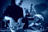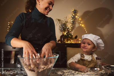 Joyful Mom Baking With Child For Christmas In Cozy Home Kitchen