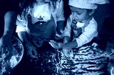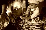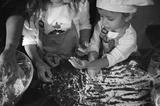 Family Baking Christmas Cookies: Mother And Kids Mixing Flour In Cozy Kitchen