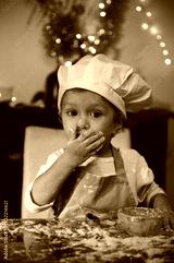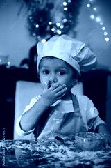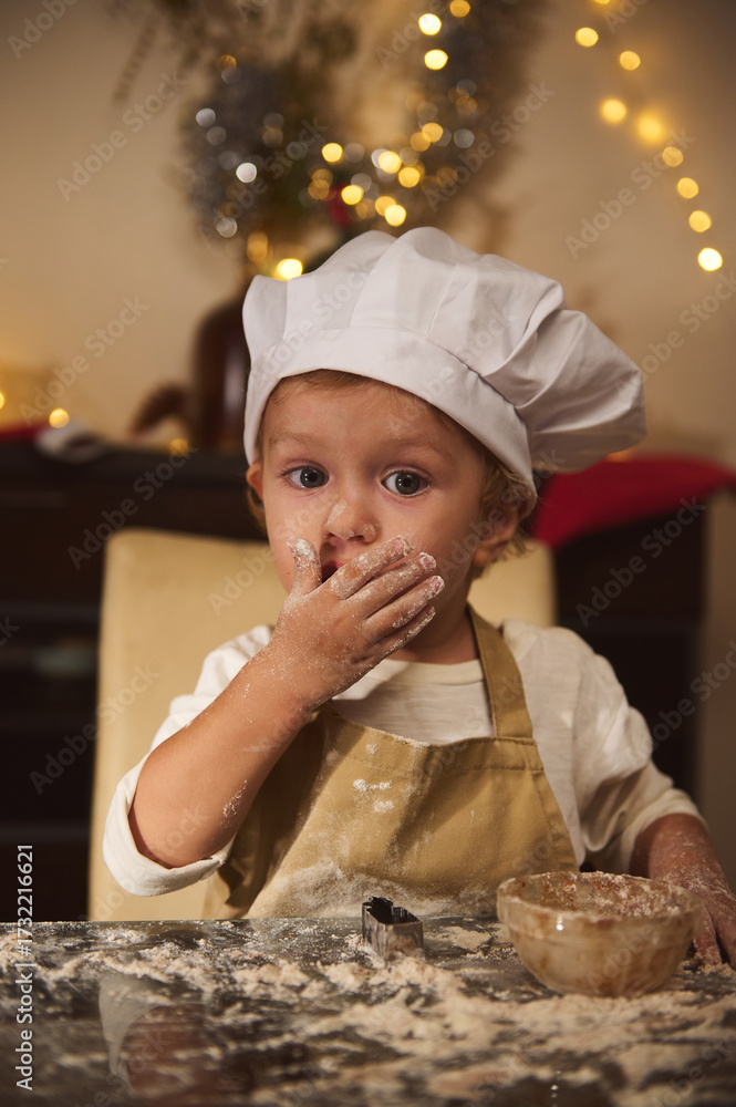 Adorable Child Chef Baking Gingerbread With Floury Hands During Christmas At Home
