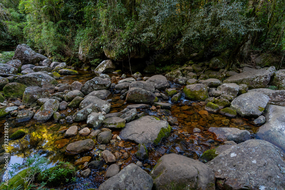A beautiful waterfall with clear, cold water in a stunning natural environment surrounded by Atlantic Forest during a hike and trail in the Serra dos Órgãos National Park, Petrópolis, Brazil.