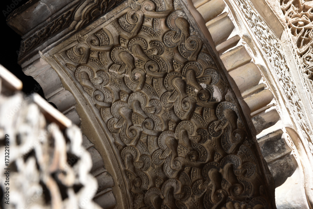 Carved stone gate arch, carved wooden archtectural details, Medersa bou Inania, Fez, Morocco