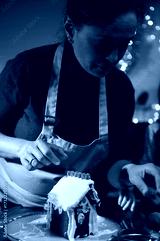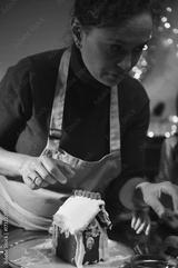 Woman Decorating Gingerbread House During Christmas At A Cozy Home Kitchen