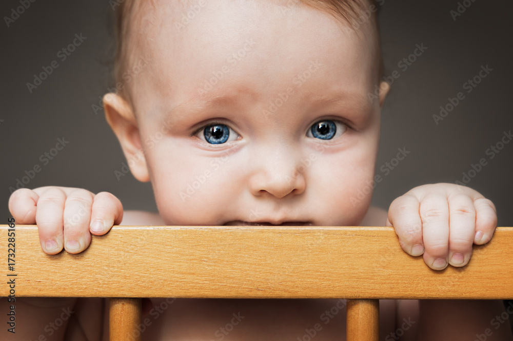 A close-up portrait of a sad baby holding onto the crib railing. Concept of social problems in the family