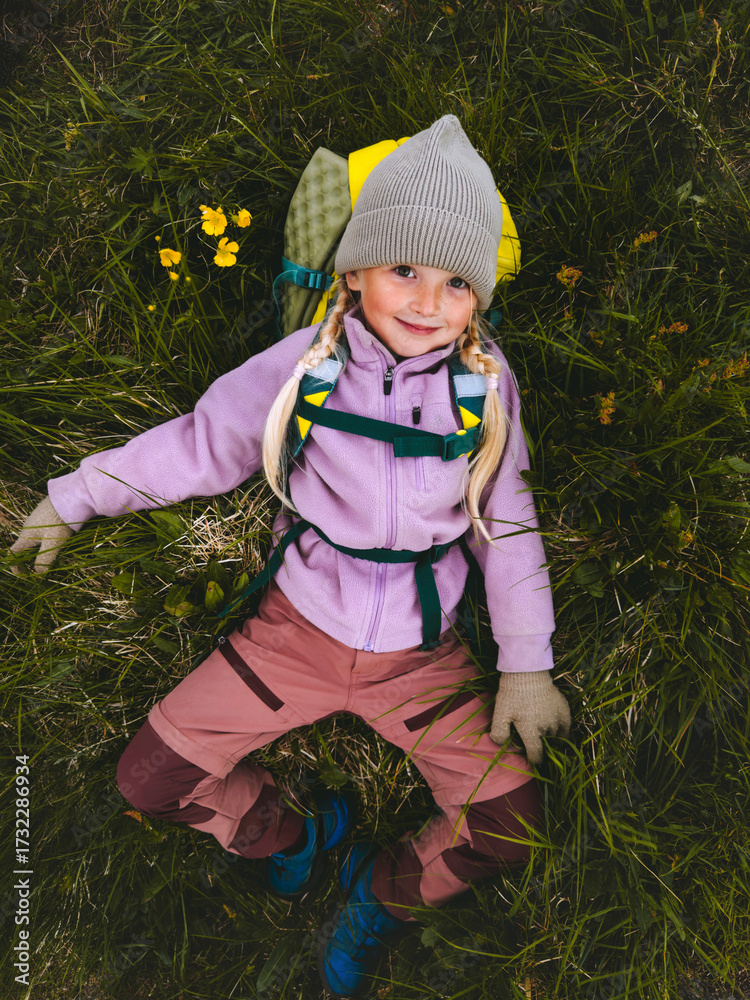 Child girl lying on grass happy smiling 5 years old kid hiking with backpack outdoor looking at camera family travel vacations candid emotions