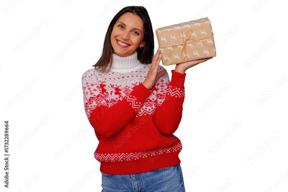 Woman smiling holding brown gift box with reindeer pattern, celebrating holidays, delivering christmas present