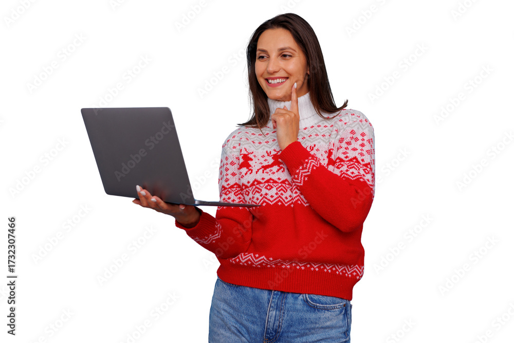 Woman in christmas sweater thinking, using laptop for online holiday shopping or festive video call, transparent background