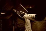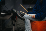 A person seated while engaged in playing an electronic drum set. Captures a relaxed and creative atmosphere of music practice within an indoor space.