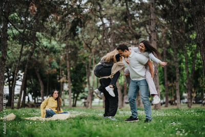 Friends enjoying outdoor activities together, playing in a scenic green park, embodying energy, laughter, and companionship on a bright day.