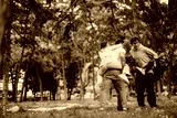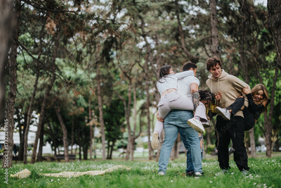 A cheerful group of friends spends quality time outdoors, engaging in playful interactions amidst a serene forested park setting, enjoying camaraderie and nature.