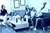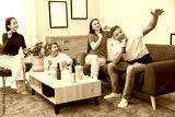 Young man singing karaoke with friends at home