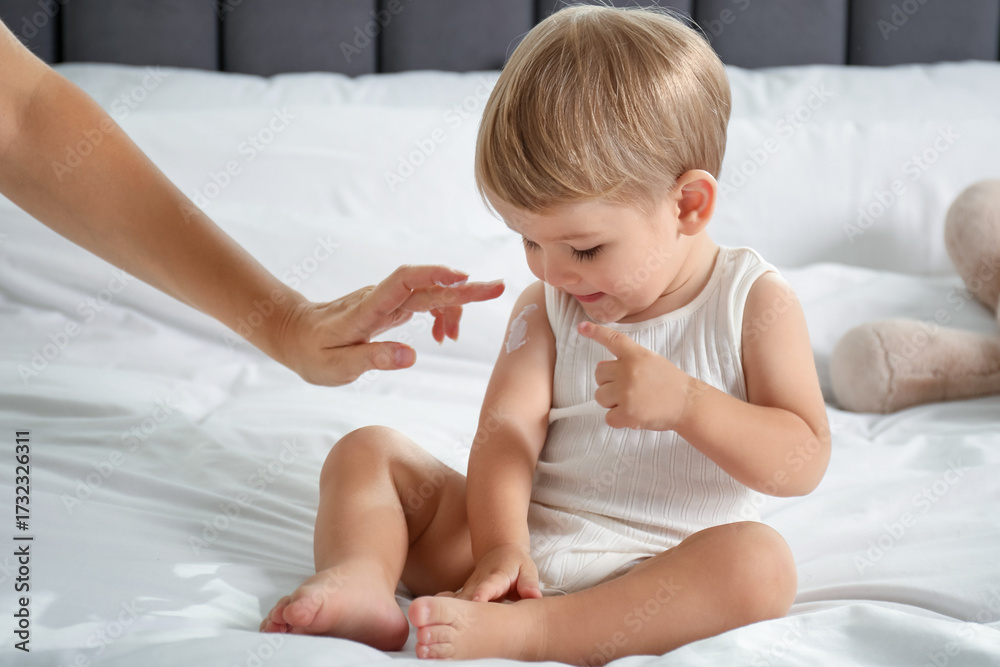 Mother applying cream onto her baby's arm on bed at home, closeup