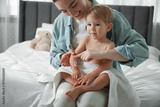 Mother applying cream onto her baby's arm after bath on bed at home, closeup