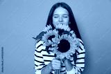 Teenage girl with bouquet of beautiful sunflowers on light blue background