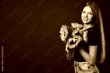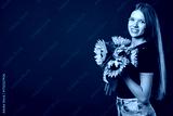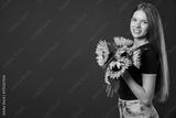 Teenage girl with bouquet of beautiful sunflowers on brown background, space for text