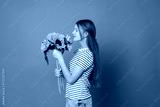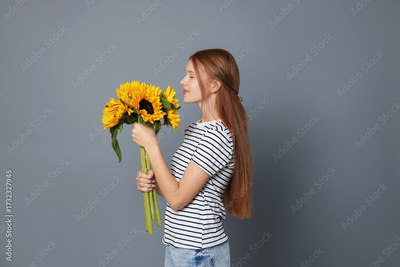 Teenage girl with bouquet of beautiful sunflowers on grey background