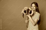 Teenage girl with bouquet of beautiful sunflowers on grey background, space for text
