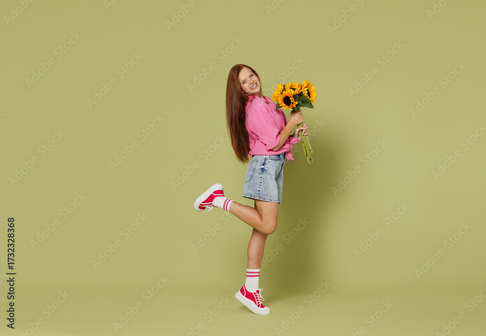 Teenage girl with bouquet of beautiful sunflowers on green background