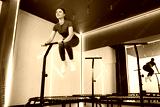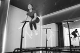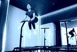Smiling woman jumping on mini exercise trampoline in fitness studio, low angle view