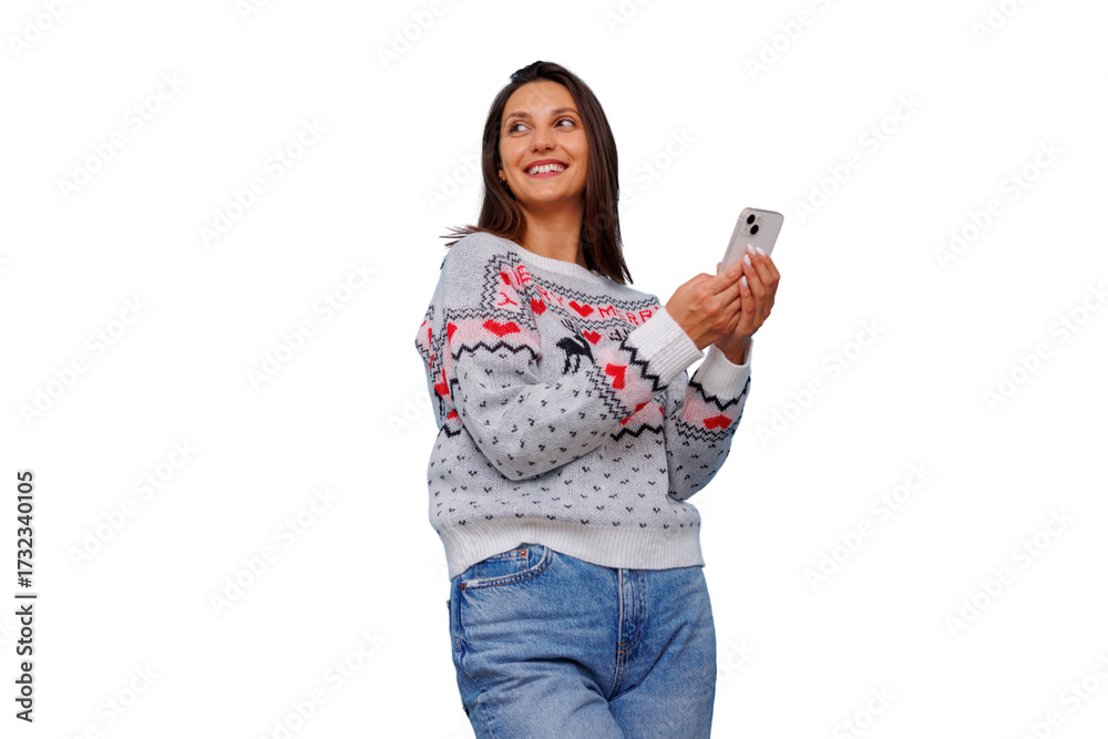 Woman wearing festive christmas sweater holding smartphone, smiling, looking away on transparent background
