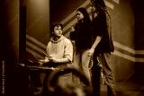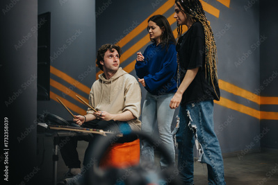 Friends gather in a casual indoor setting, engaging with a musical setup. Their interaction highlights art, creativity, and connection, captured in a modern and artistic environment.