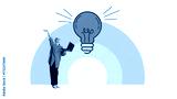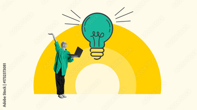 Graphic artwork. Excited woman with laptop under glowing lightbulb on yellow arc background. Concept of creative energy, inspiration, modern business, joyful discovery, and digital branding.
