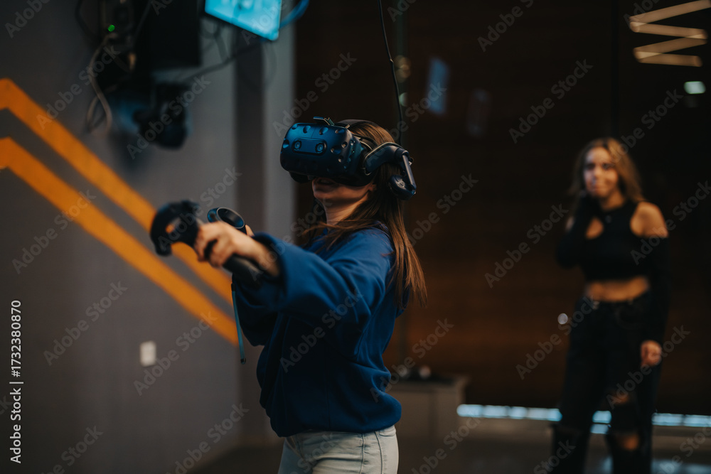 A young woman actively exploring virtual reality gaming while her friend watches, showcasing engaging game play and advanced technological entertainment in a contemporary indoor setting.