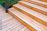 Teak wood steps with path of elevated walkway in public park area, High angle and perspective side view with copy space