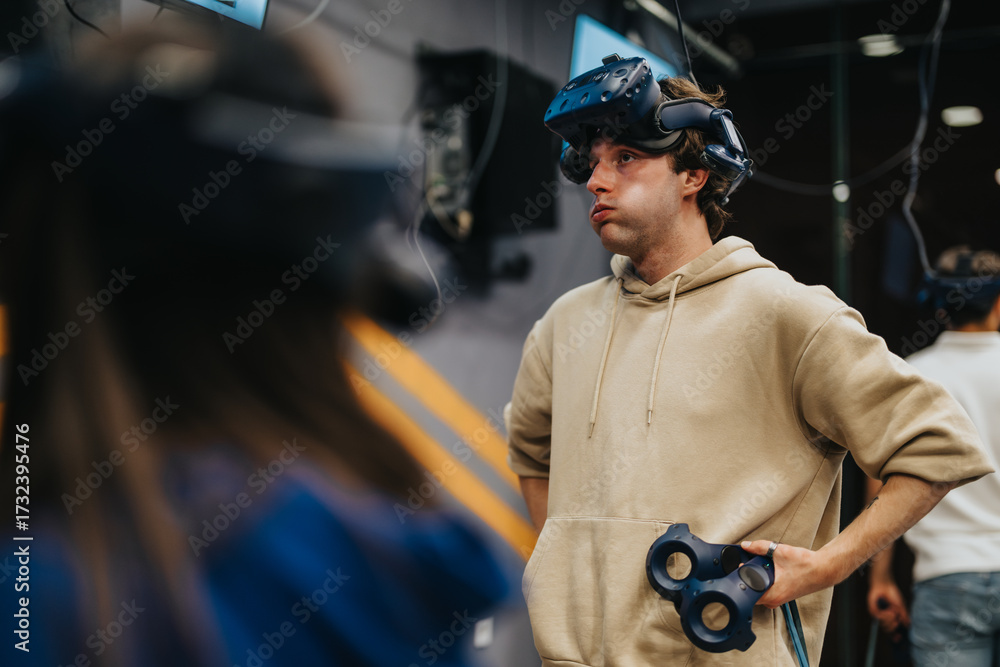 Participants utilize VR headsets and controllers while exploring a virtual reality environment, highlighting technology, entertainment, and social interaction in a shared activity setting.