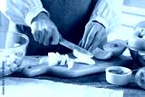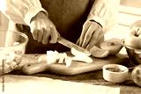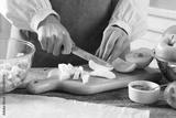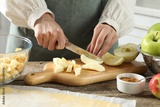 Making delicious apple strudel. Woman cutting fresh fruit at wooden table in kitchen, closeup